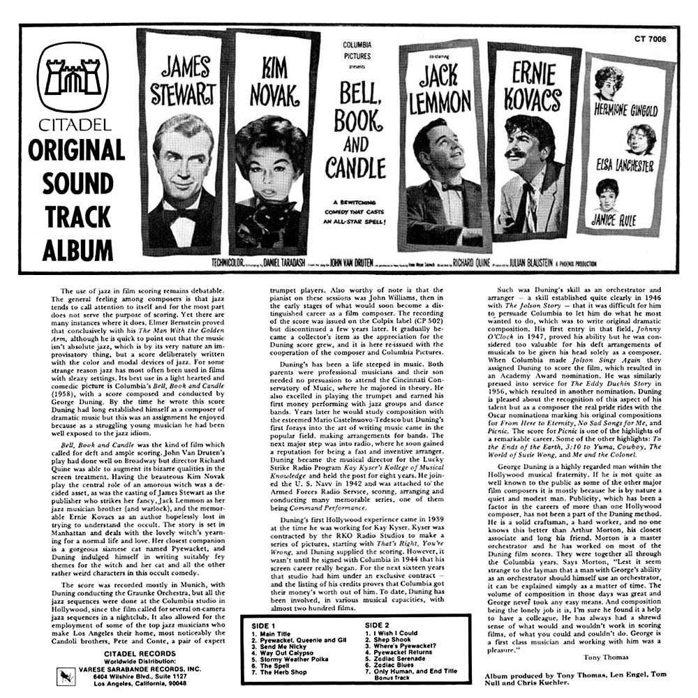 England's Harkit Records continues to mine the retrograde treasure trove of 1960s film music with three new releases that are a delight of the period. Making its first foray onto CD, George Duning's lighthearted and theatrical score for 1959's BELL, BOOK, AND CANDLE (HRKCD 8099) is reissued from the Colpix LP with an additional track, a vocal track from French Actor Philippe Clay who appears in a cabaret act in the film. Duning's score is gently jazzy, mostly comprised of easy listening tracks the blend into and out of the source music used prominently in the film. Some cues are rather bland, others really standout (like the show tune-like Main Title, the spooky mysterioso take on the Main Title melody incarnated into a moaning, witchlike vocal of "The Spell," and its more lushly romantic variant, "Pyewacket Returns", the night club jazz of "Way Out Calypso" and a sultry arrangement of Arlen/Kohler's "Stormy Weather.") It's an enjoyable enough score although not exceedingly dramatic. Duning coats the film with a pleasing polish of melodic gloss and enough toe-tapping riffs to enhance the stagy drama of the production, which is really all the film needed. The movie's subtext (that it may have been more about 1950s homosexuality than witchcraft, in which case Duning's sensuous melodies seem all the more apt. Duning's other efforts include PICNIC, THE DEVIL AT 4'OCLOCK, several scores for STAR TREK's original incarnation, 1974's TERROR IN THE WAX MUSEUM, and, his final score, the sci-fi telefilm, GOLIATH AWAITS; very little of his 70+ film scores [not to mention library tracks reused in more than 300 films] were preserved on LP or CD, which makes this release especially noteworthy.) Perceptive and comprehensive liner notes (not signed, but presumably by CD producer Daniel Porter) fill the 6-page booklet to the brim, enhanced by color photos from the movie. The package is nice, although, as a collector, I would have preferred to see the original LP cover reproduced on the front of the CD although, in retrospect, perhaps the part of me that isn't just a collector will just have to make do with the close-up of Kim Novak provocatively gobbling a pearl necklace... |